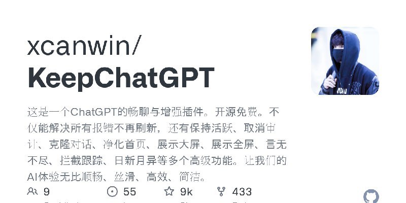 这是一个ChatGPT的畅聊与增强插件。开源免费。不仅能解决所有报错不再刷新,还有保持活跃、取消审计、克隆对话、净化首页、展示大屏、展示全屏、言无不尽、拦截跟踪、日新月异等多个高级功能。让我们的AI体验无比顺畅、丝滑、高效、简洁。 - GitHub - xcanwin/KeepChatGPT: 这是一个ChatGPT的畅聊与增强插件。开源免费。不仅能解决所有报错不再刷新,还有保持活跃、取消审...